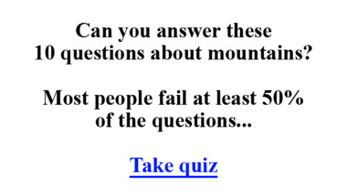 5/10 is the score to beat in this trivia quiz to put yourself over the average quiz taker. But you're probably going to be able to answer questions "What is the world´s longest mountain range, that lies as a continuous chain of highl.." and "What mountains divide France from Spain?" easy!