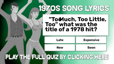 In this fun trivia quiz we're going to ask questions like ""Too Much, Too Little, Too" what was the title of a 1978 hit?" and ""And hear them echo through the hills, For peace through out the land" is from which ..".
