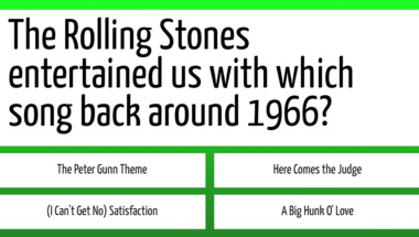 5/10 is the score to beat in this 1960s Songs quiz to put yourself over the average quiz taker. But you're probably going to be able to answer questions "The Rolling Stones entertained us with which song back around 1966?" and "Sonny and Cher entertained us with which song back around 1966?" easy!