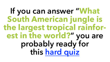7/10 is the score to beat in this trivia quiz to put yourself over the average quiz taker. But you're probably going to be able to answer questions "What South American jungle is the largest tropical rainforest in the world?" and "What complex serves as the official residence of the President of the Russian Federat.." easy!