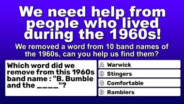 In this fun 1960s bands with a missing word quiz we're going to ask questions like "Which word did we remove from this 1960s band name : "The Cuff ____"?" and "Which word did we remove from this 1960s band name : "Gerry & The ____"?".