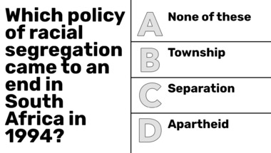 Look forward to questions like "According to the nursery rhyme, what has Little Bo Peep lost?" and "Which policy of racial segregation came to an end in South Africa in 1994?"