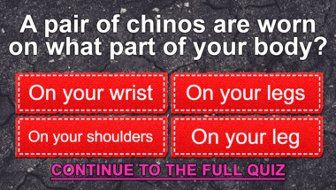 In this fun trivia quiz we're going to ask questions like "To change from one position or place to another is to?" and "A pair of chinos are worn on what part of your body?".